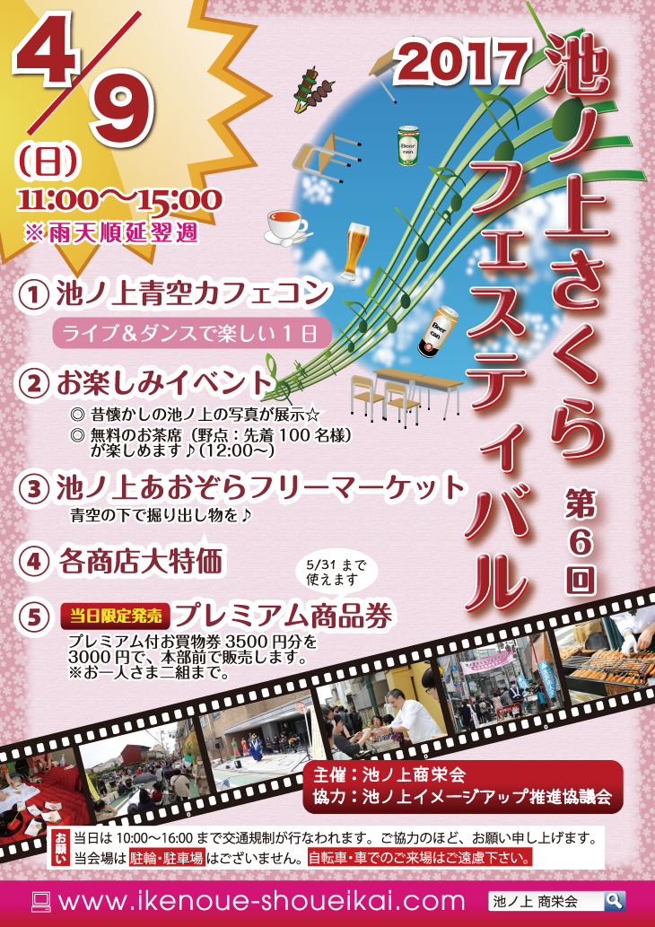 | 日時 | 2017年4月9(日) 11:00-15:00 ※雨天翌日順延(順延日の16日[日]に延期) |